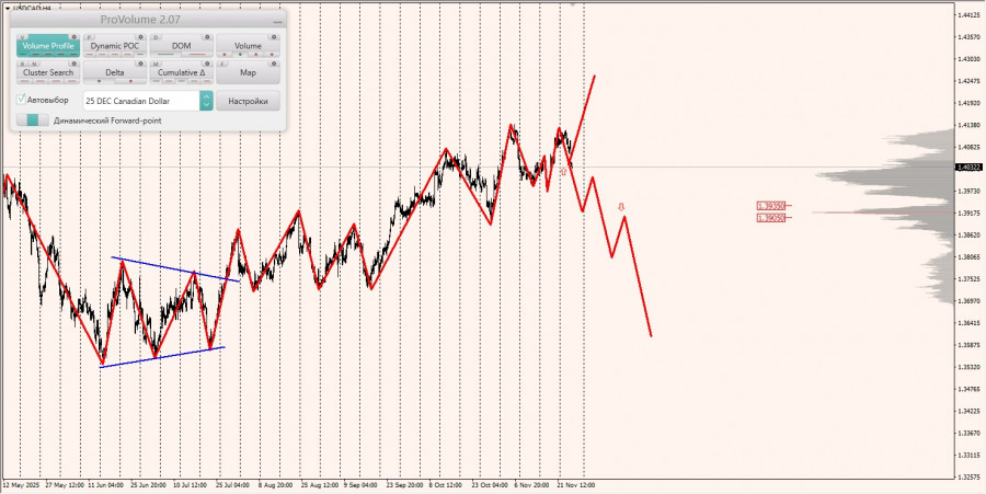 Область выгодных цен на покупку с точки зрения маржинального обеспечения располагается между зонами 1/4 и 1/2, построенными от максимума 21.11.2025.