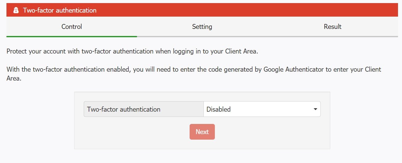 1. To set up two-factor authentication, select the relevant option in the Client Area (tab "Account Settings >> Two-Factor authentication").